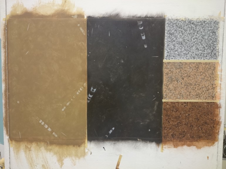 Granit målade jag genom att först pensla på hela ytan med pigment 1 (se nedan) och stöpplade det. Sedan tryckte jag försiktigt med en fuktig natursvamp för att ta fram den grå grundfärgen. Natursvampen användes sedan för att applicera pigment 2 och slutligen pigment 3. Lätt fördrivning mellan varje lager. På slutresultatet borde då alla lager synas. Sist stänks lite vit färg på alla.