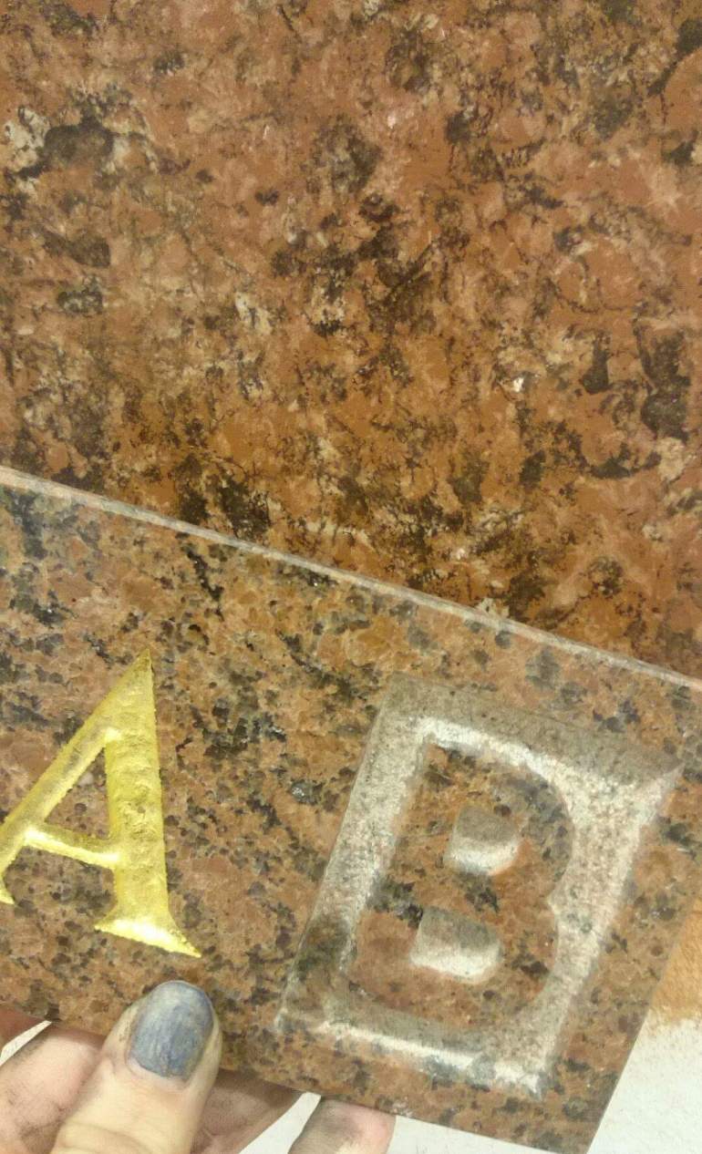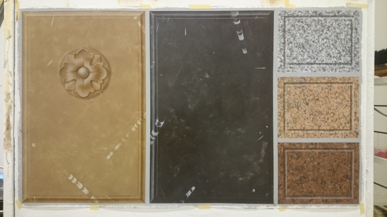 Imitationen av kalksten och granit är nu klar. Pigmenten titanvit, universalgrön, signalröd & bränd sienna blev tillsammans en gråton som användes till den röda kalkstenen. Svart kalksten krävde endast svart och vitt pigment. Jag penslade amorft för ljusare och mörkare partier, tryckte med en trasa och svamp för ytterligare ljusa partier och fördrev.