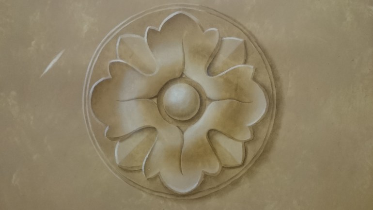 Allt är klart och endast skuggor kvarstår för imitationen. Linjer ritades med akvarellpennor för att lätt försvinna när jag målar över dem. Blomman ritade jag upp genom att först ha den på ett papper som mall. På baksidan av pappret penslades kritvatten på och efter torkning sattes den upp med tejp på önskad plats och jag ritade då längs alla linjer med en penna så att motsvarande, torkade kritmängd på baksidan av pappret utgjorde samma linjer på kalkstenen.