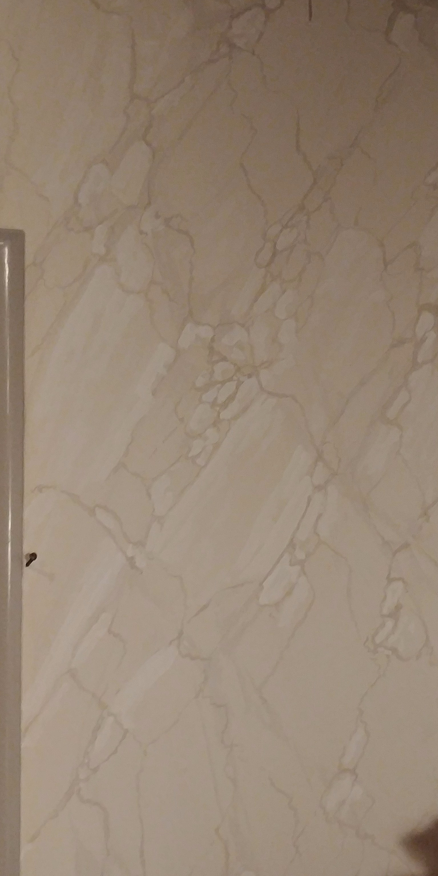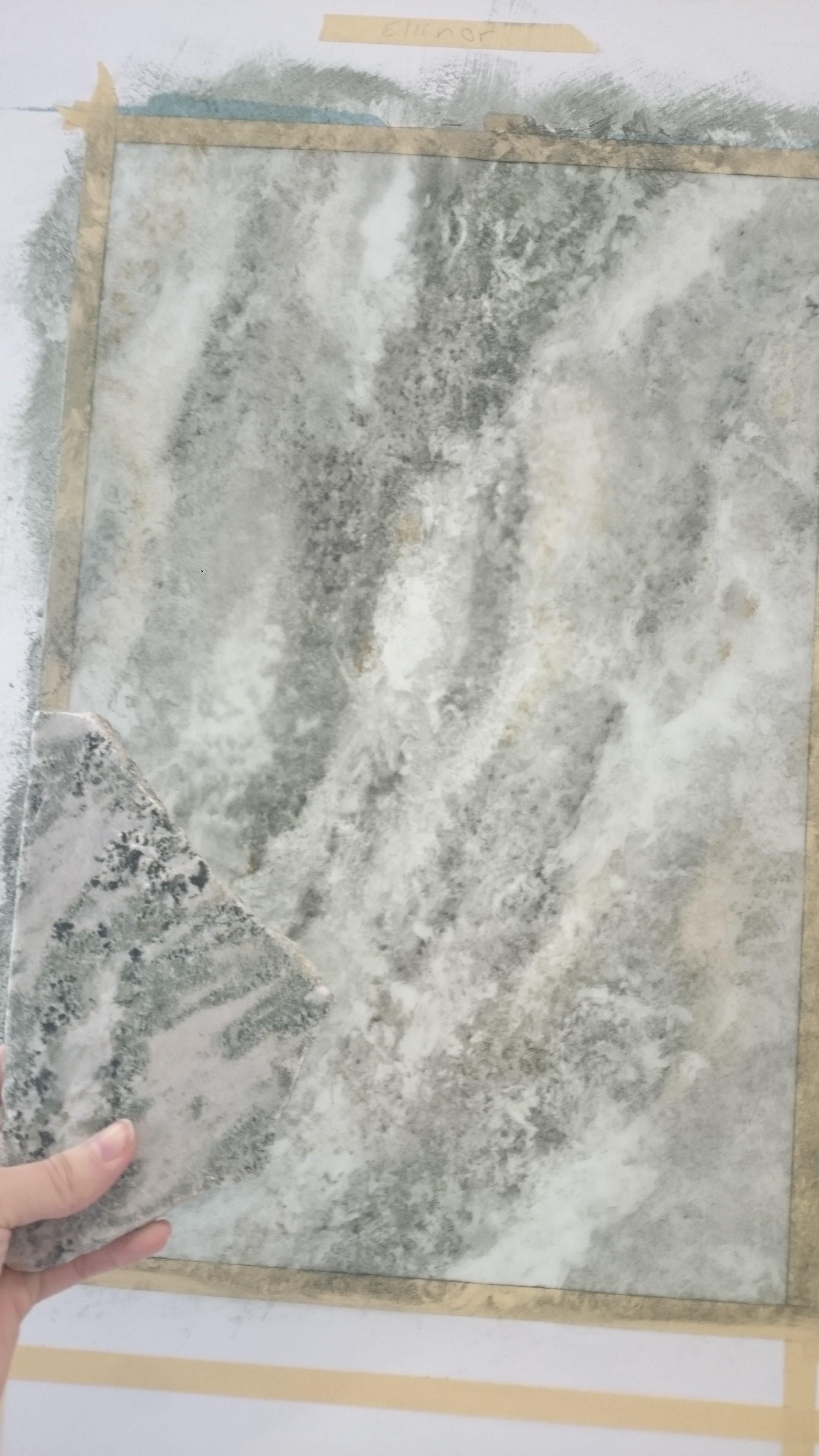 Carrara målade jag genom att först pensla på titanvitt pigment över hela ytan och använde sedan grå umbra blandat med lite ultramarin i olika valörer till sprickorna. Det man ska se upp för när man målar den här sortens marmor är bokstäver. Hjärnan vill nämligen göra lika stora mellanrum mellan alla ränder och det blir då lätt bokstäver (X, V, Y, A, O) av sprickorna, man måste säga emot den känslan för att det ska se äkta ut.